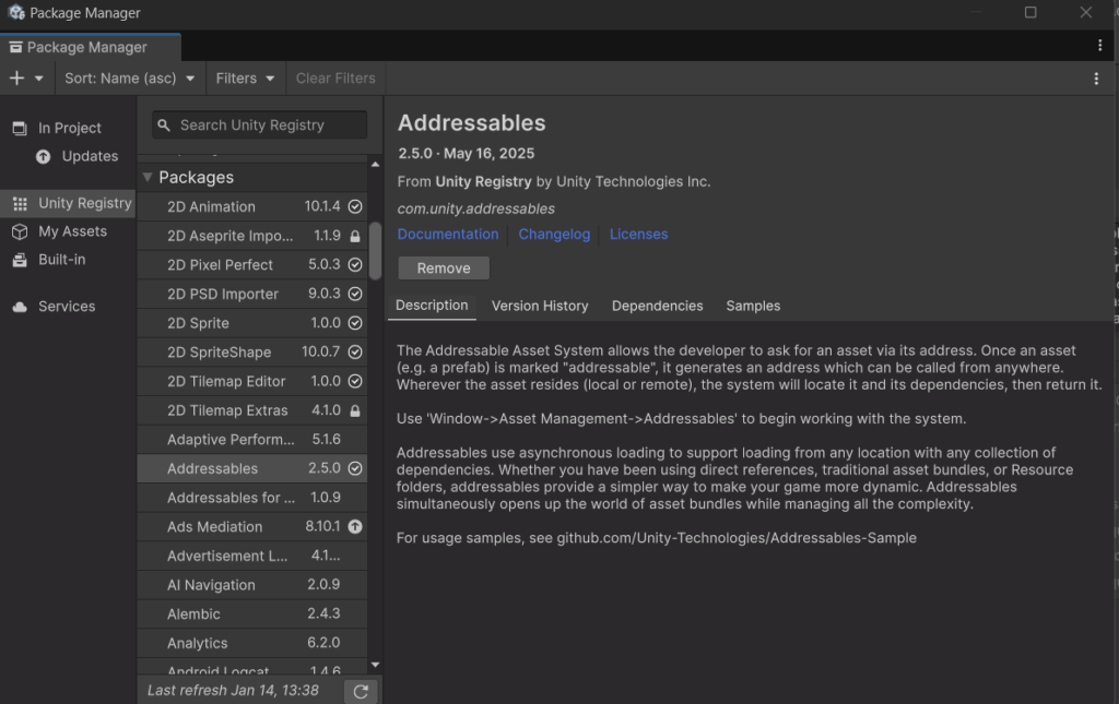 前回、CCD を有効化しましたが、Addressables は 自動ではインストールされません。