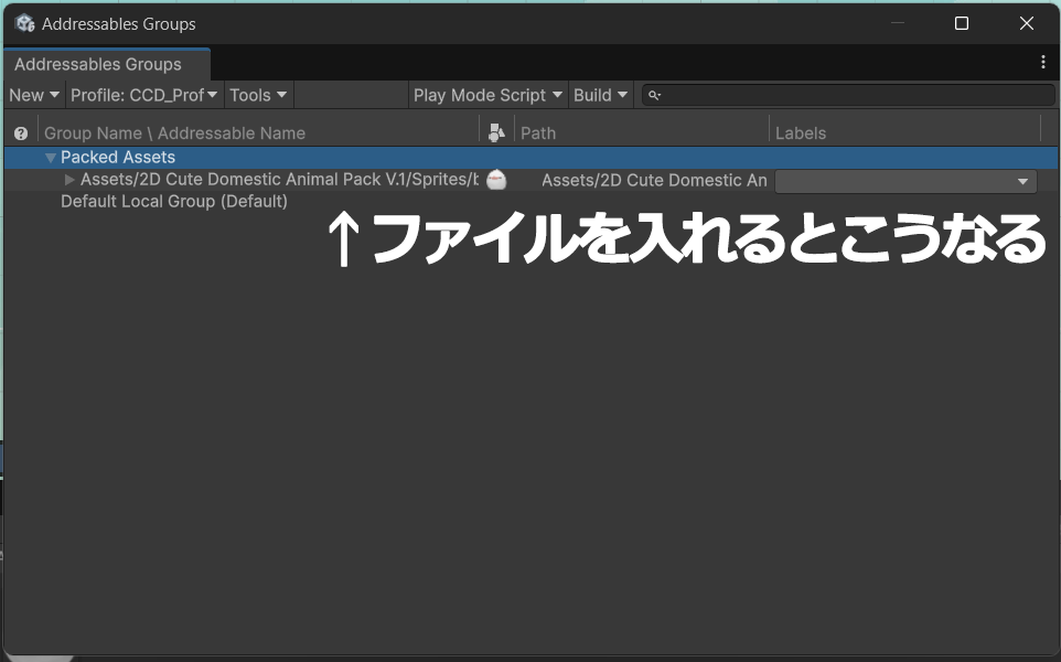 初回ビルドを成立させるため、軽いアセットを1つだけ登録しておきます。ここで言う「アセットを入れる」とは、Addressables Groups ウィンドウ上に登録することを指します。