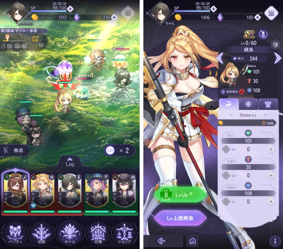 第5弾は放置系ハクスラRPGです。プレイヤーがアプリを閉じている間も、美少女武将たちが「奈落の迷宮」を突き進み、敵を倒して装備や経験値を稼いでくれます。結構おもしろそうだったのですが、PF都合により5ヶ月くらいでサ終となってしまいました。